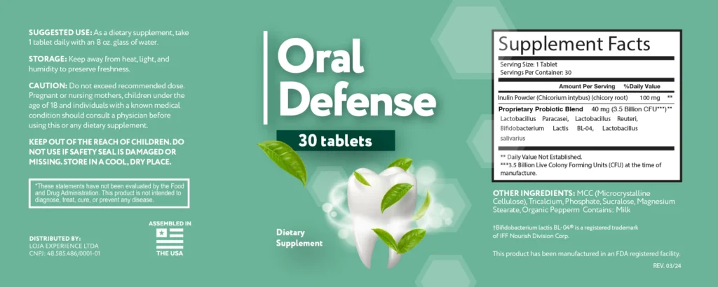 Oral Defense combines specialized probiotics for oral health with prebiotics that feed these beneficial bacteria, creating a balanced and naturally protected oral ecosystem.
